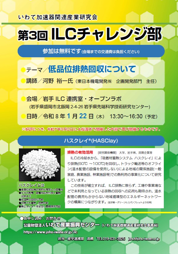 いわて加速器関連産業研究会では、下記により第3回ILCチャレンジ部を開催することといたしました。